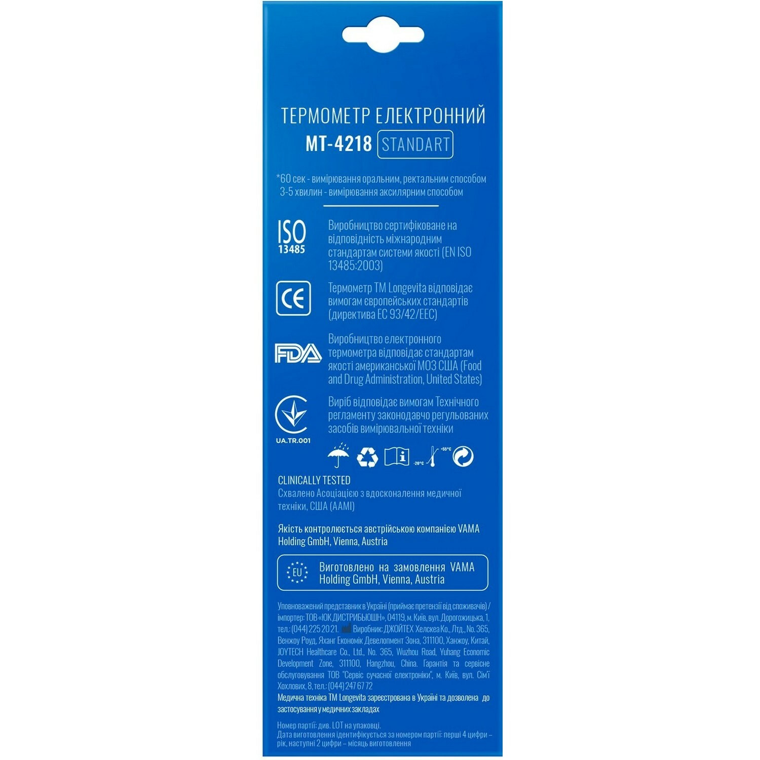 - Час вимірювання: від 60 секунд (орально/ректально)
