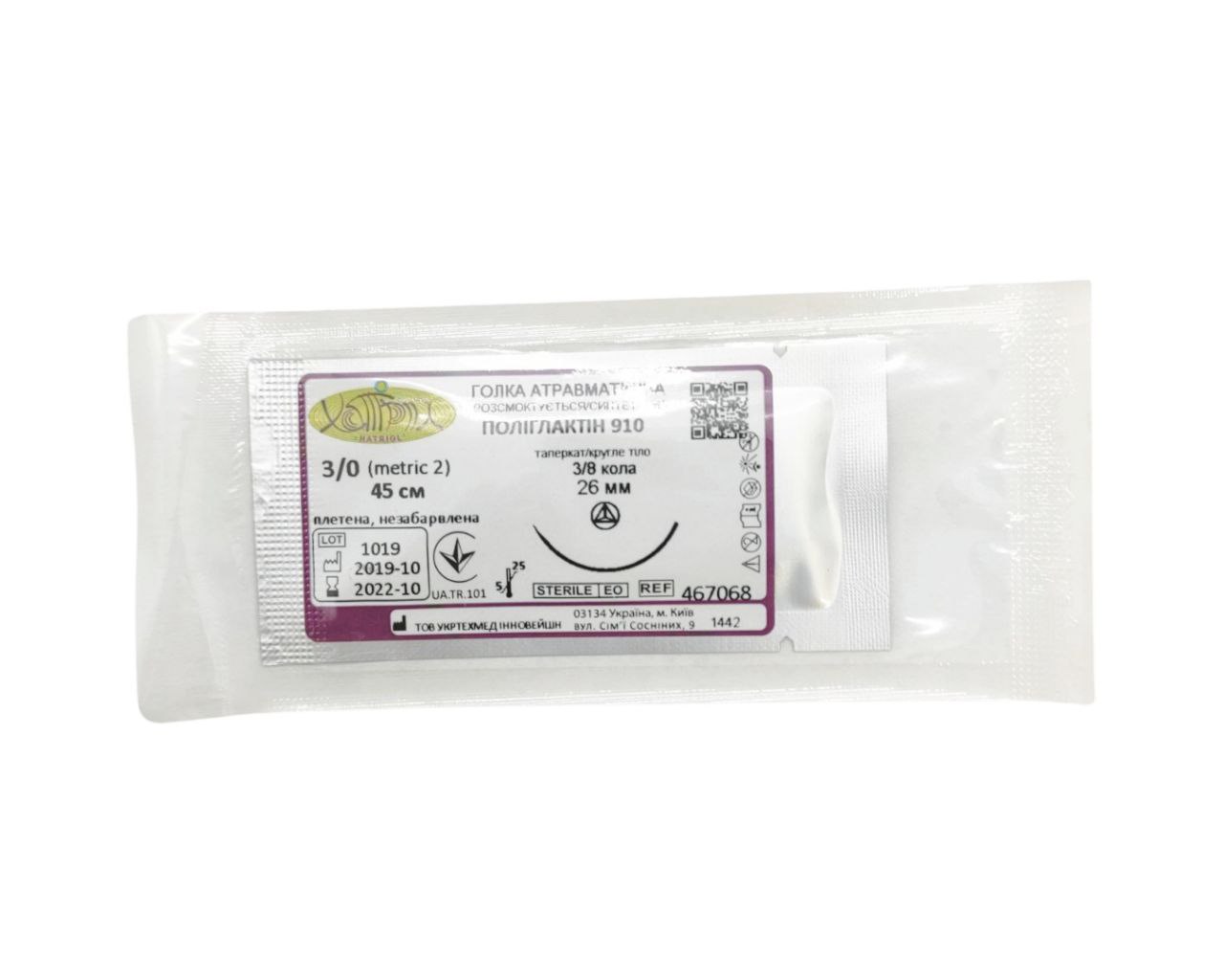 Шовний матеріал ПОЛІГЛАКТІН 910, 3.0 / 45 см