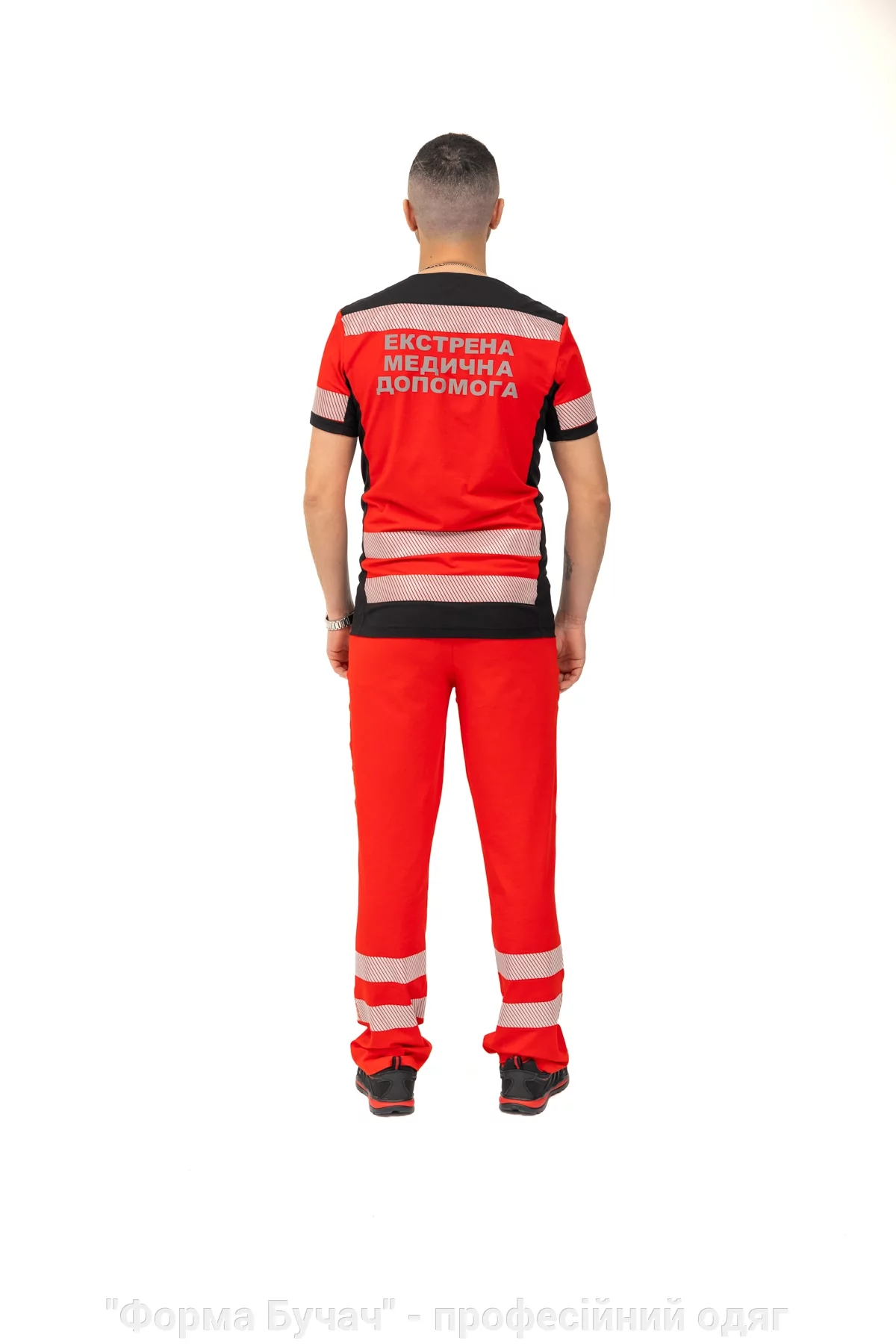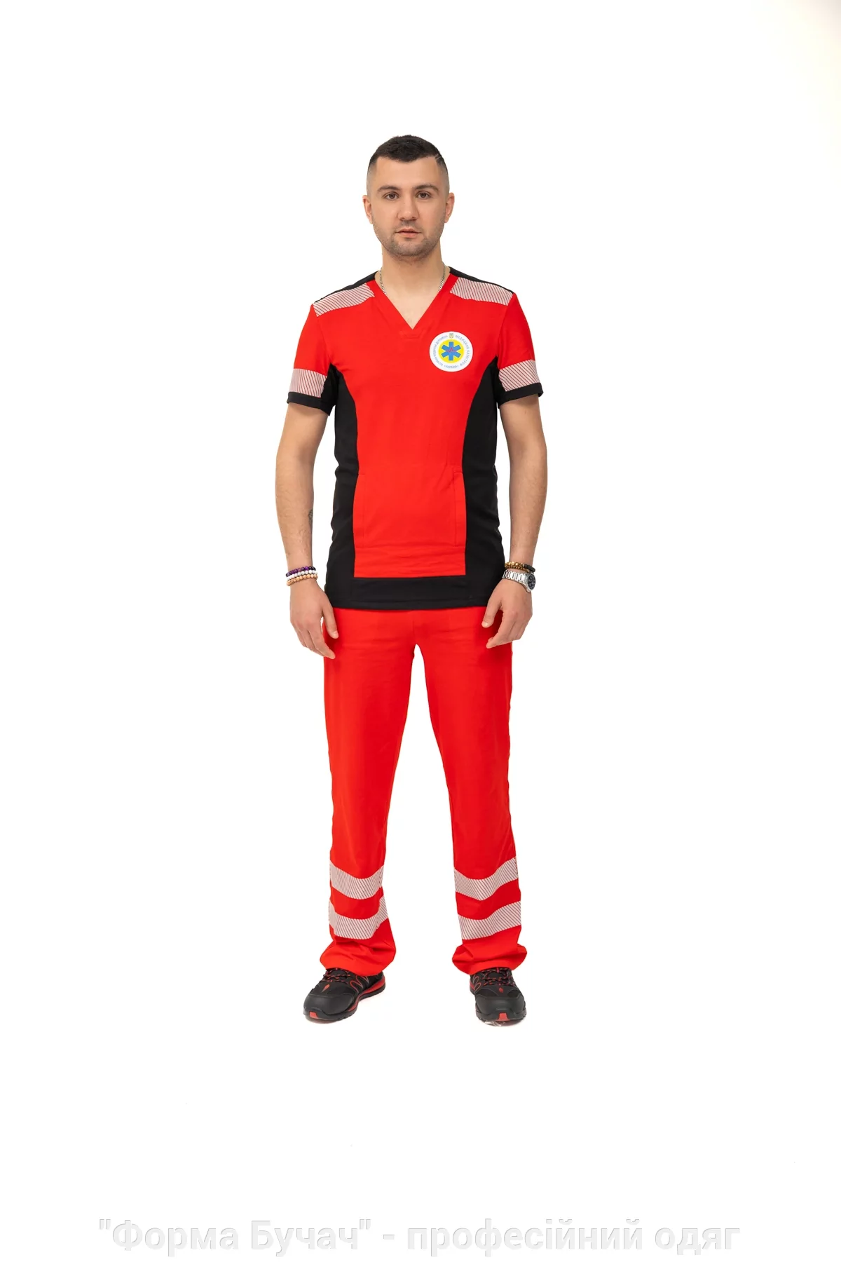 👚 Блуза з V-подібним вирізом —анатомічного чоловічого крою, без застібок, легко одягається, з двома функціональними кишенями, світлоповертаючими стрічками та елементами ідентифікації: термоклейовий світлоповертаючий напис “Екстрена медична допомога” на спині та термоклейовий шеврон ЕМД на грудях.