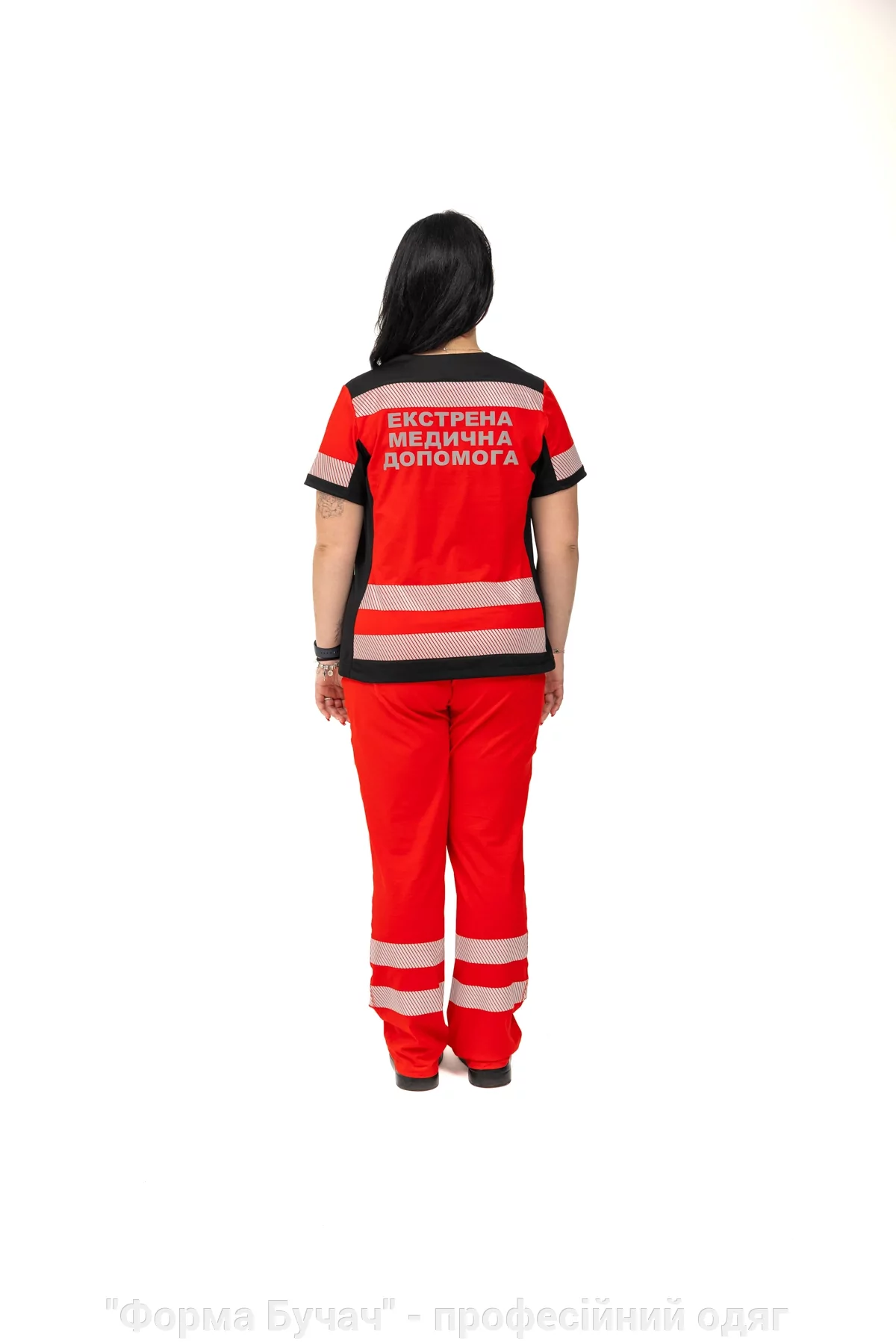 👚 Блуза з V-подібним вирізом — без застібок, легко одягається, з двома функціональними кишенями, світлоповертаючими стрічками та елементами ідентифікації: термоклейовий світлоповертаючий напис “Екстрена медична допомога” на спині та термоклейовий шеврон ЕМД на грудях.