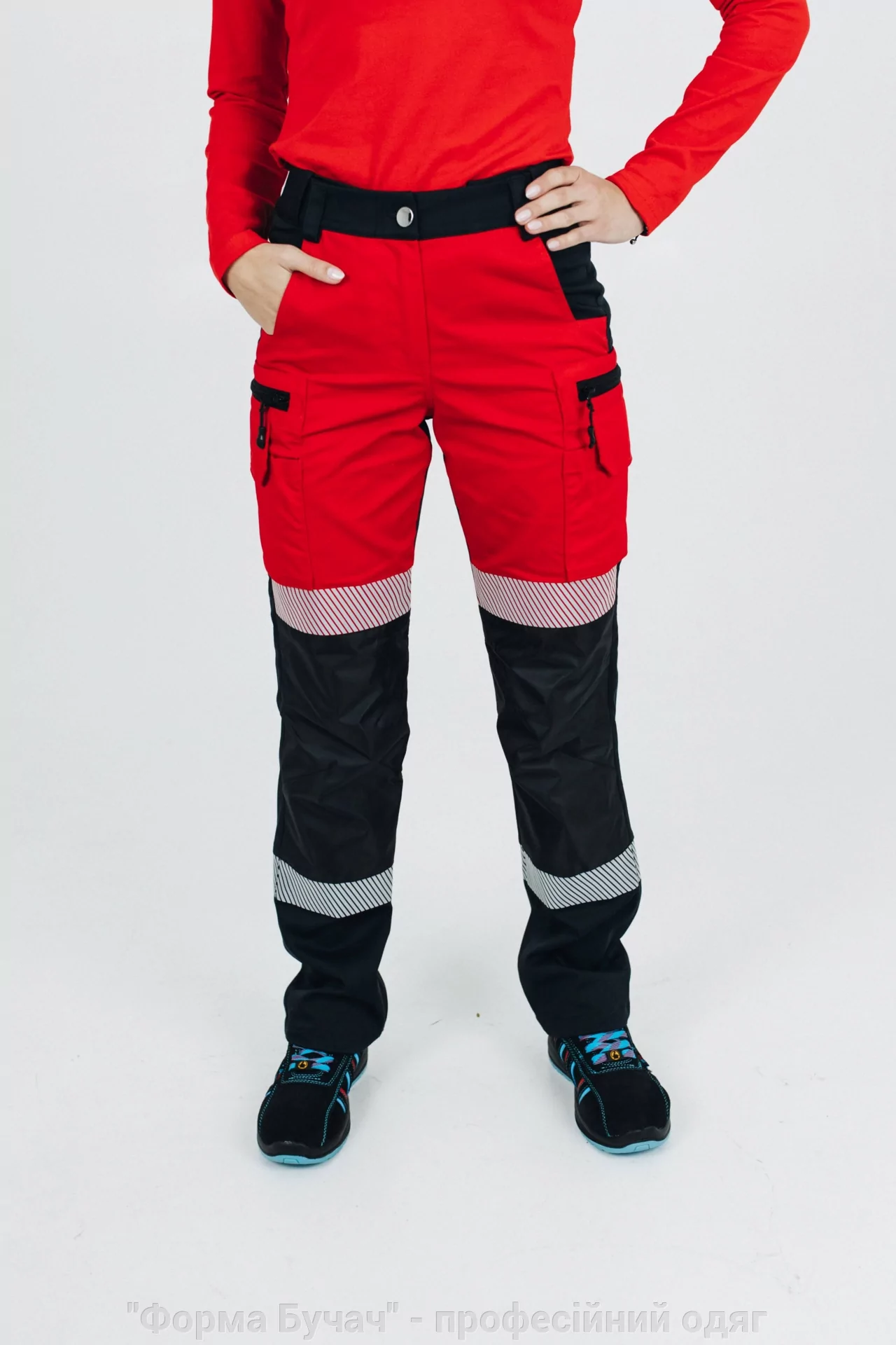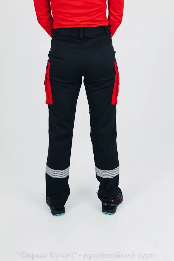 Брюки жіночі тактичного крою, висока посадка, широкий пояс, укріплений наколінник, практичні кишені. Крій анатомічної форми, дуже зручні в експлуатації, місця найбільшого забруднення виконані контрастними кольорами. Світлоповертаючі стрічки забезпечують видимість у темну пору доби.