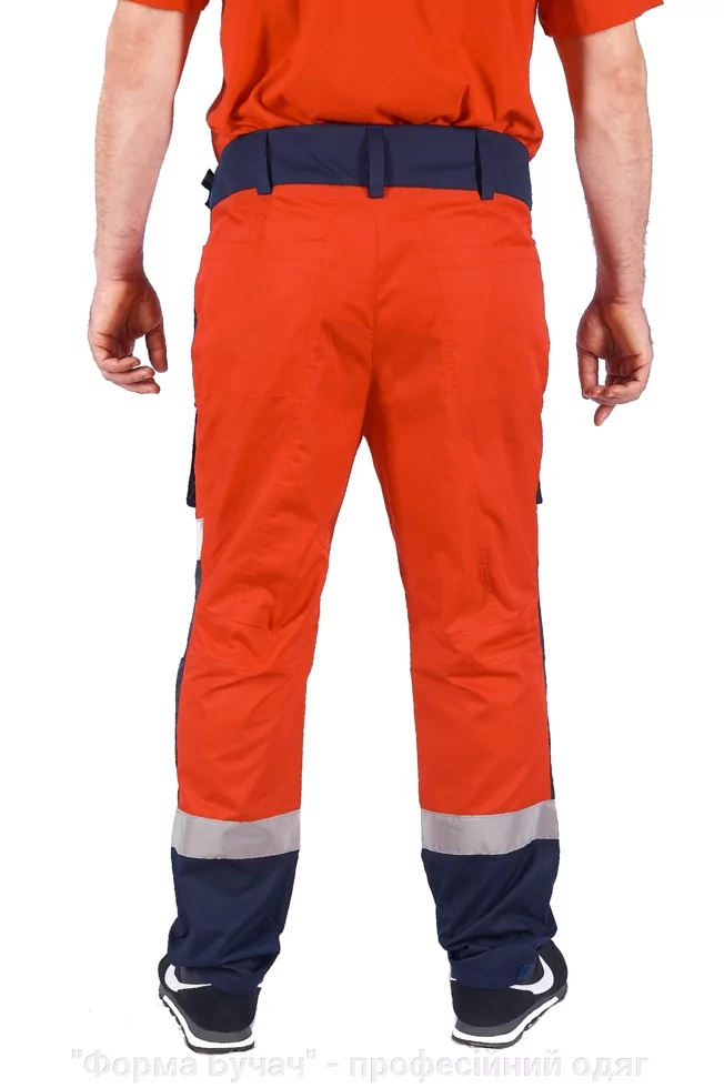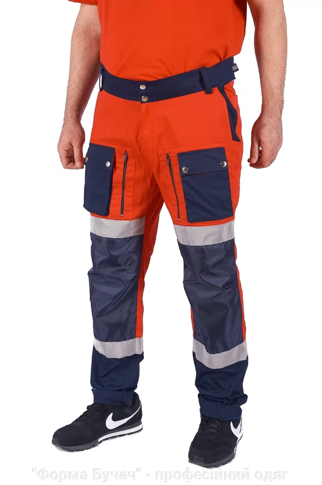 Брюки чоловічі тактичного крою, висока посадка, широкий пояс, укріплений наколінник, практичні кишені. Крій анатомічної форми, дуже зручні в експлуатації, місця найбільшого забруднення виконані контрастними кольорами. Світлоповертаючі стрічки забезпечують видимість у темну пору доби.