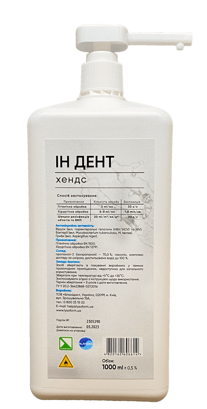 Це дезінфікуючий засіб для рук, спеціально розроблений для задоволення вимог медичних фахівців і безпечного використання клієнтами в стоматологічних клініках. Схвалений до застосування та відповідає європейським стандартам гігієнічної, хірургічної обробки рук згідно EN 1500 та EN 12791.