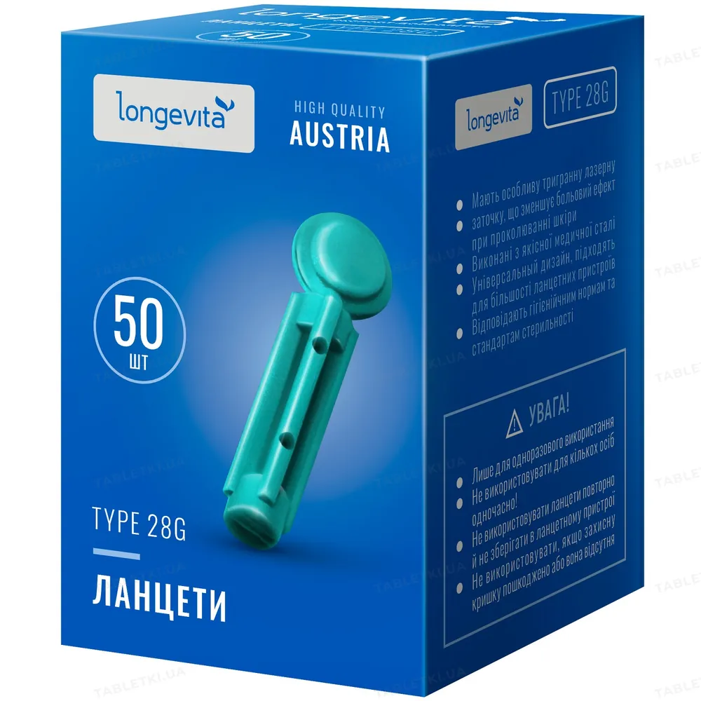 Ланцети Longevita 28G, 50 шт — універсальні стерильні голки з хірургічної сталі з лазерним заточуванням. Забезпечують безболісний прокол завдяки силіконовому покриттю. Ціна вказана за одну одиницю товару.