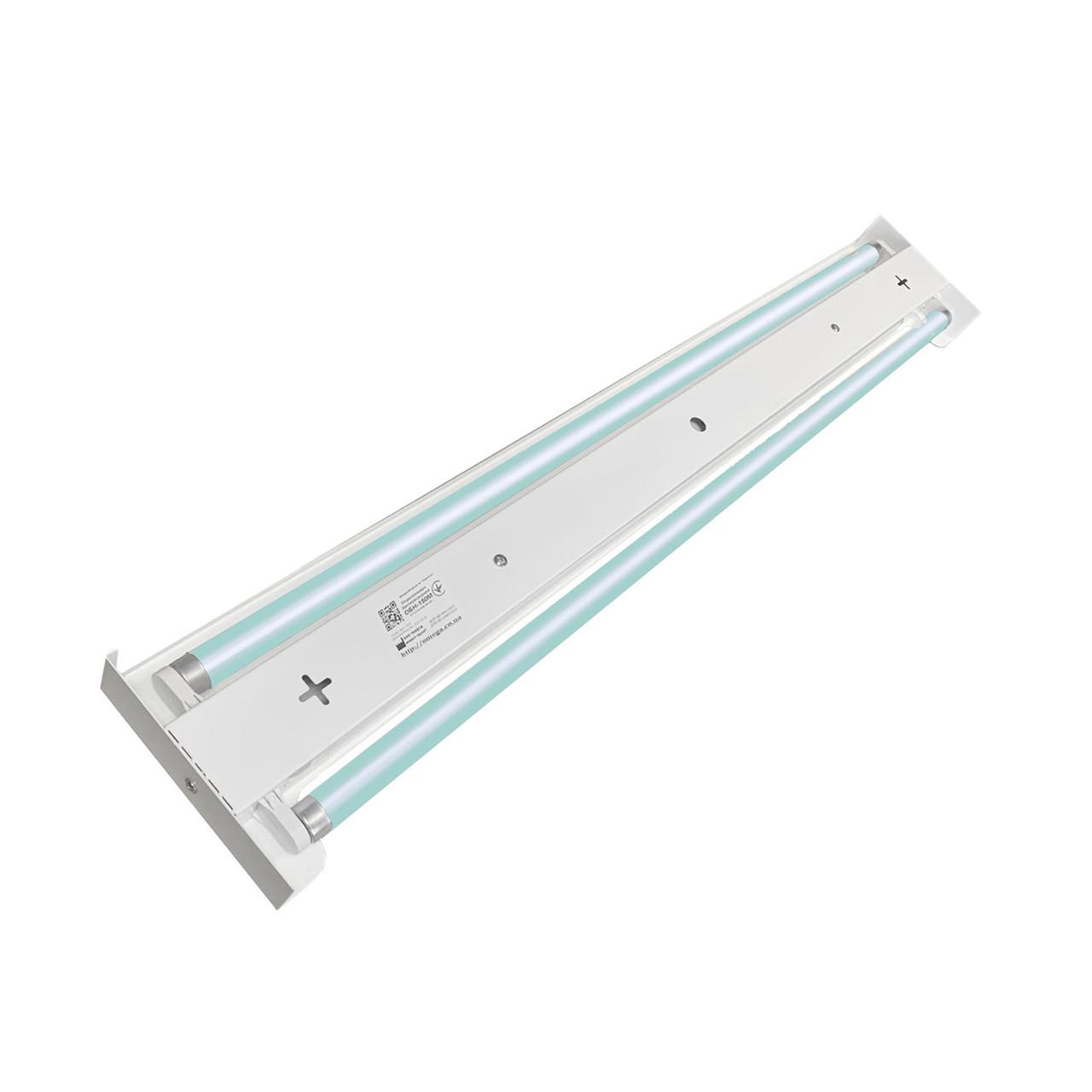- Опромінювач встановлюється горизонтально на стіну, причому верхня лампа закрита екраном і дезінфекція здійснюється за рахунок конвекції повітря. Для швидкого знезараження використовується нижня відкрита лампа. Підключення кожної лампи здійснюється окремо.