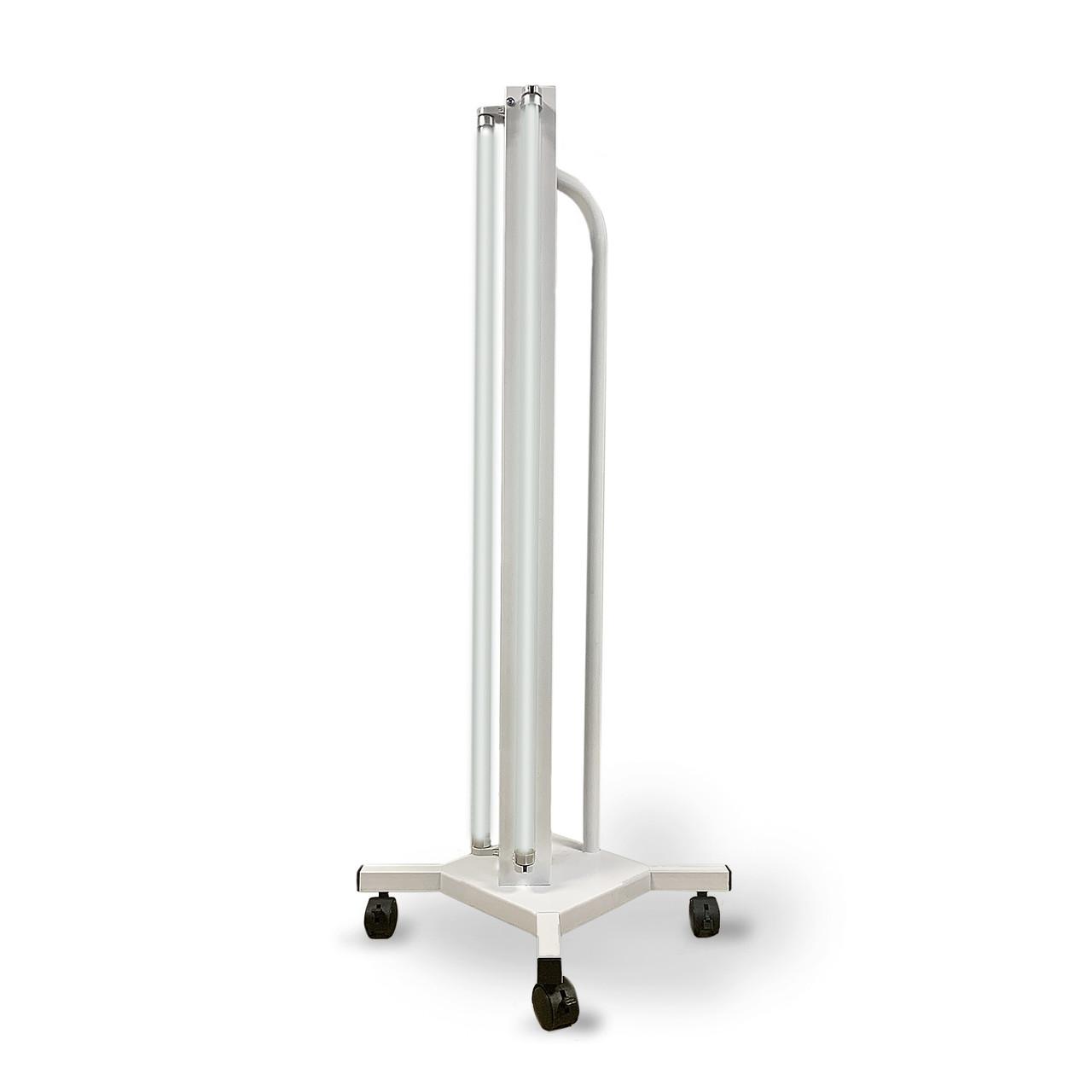 - Опромінювач комплектується двома відкритими бактерицидними лампами потужністю 30 Вт. Для зручності переміщення на стійці встановлена металева ручка.