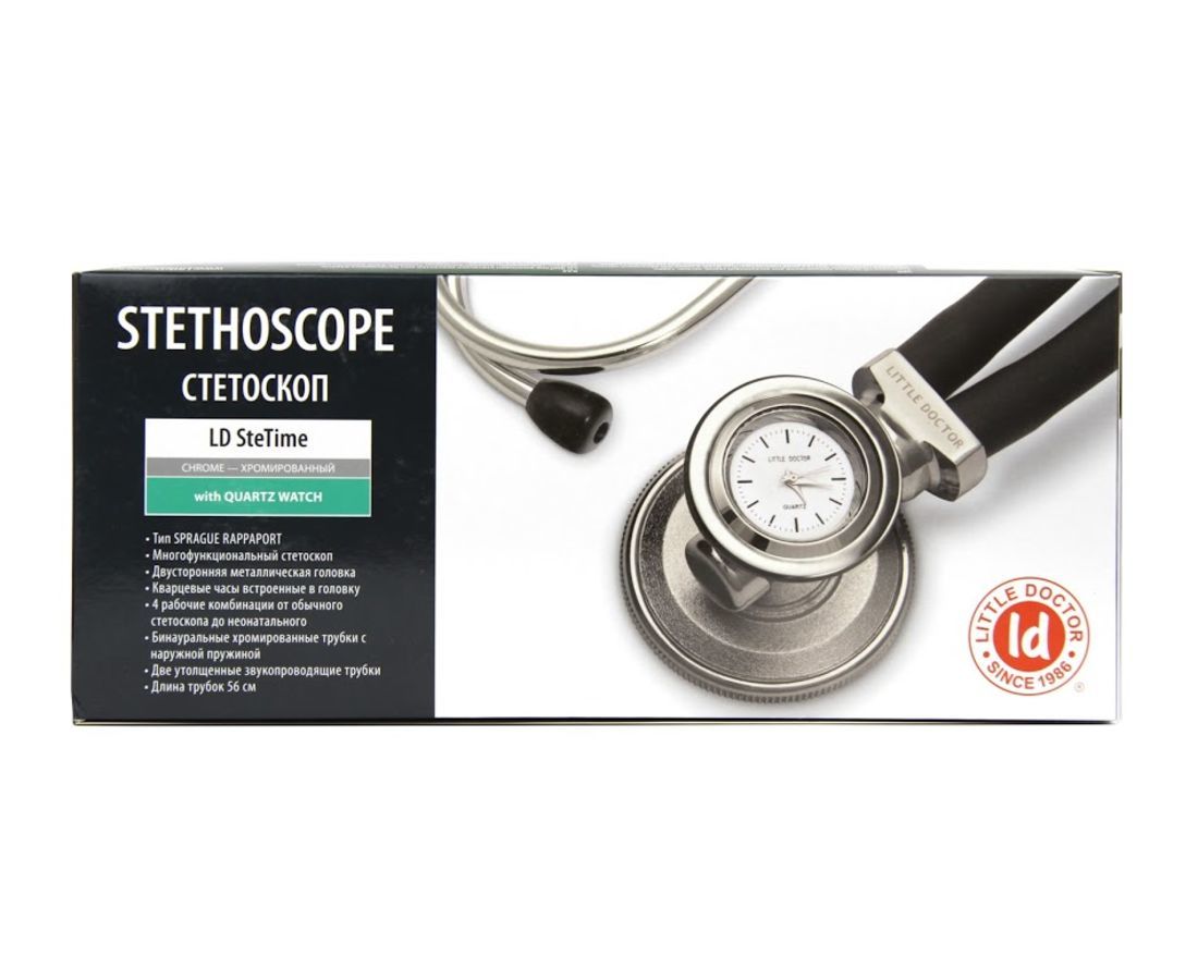 Високоякісний стетоскоп з вбудованим в голівку кварцовим годинником, призначений для аускультації серця, легень, судин, шлнково-кишкового тракту у дорослих пацієнтів та дітей.